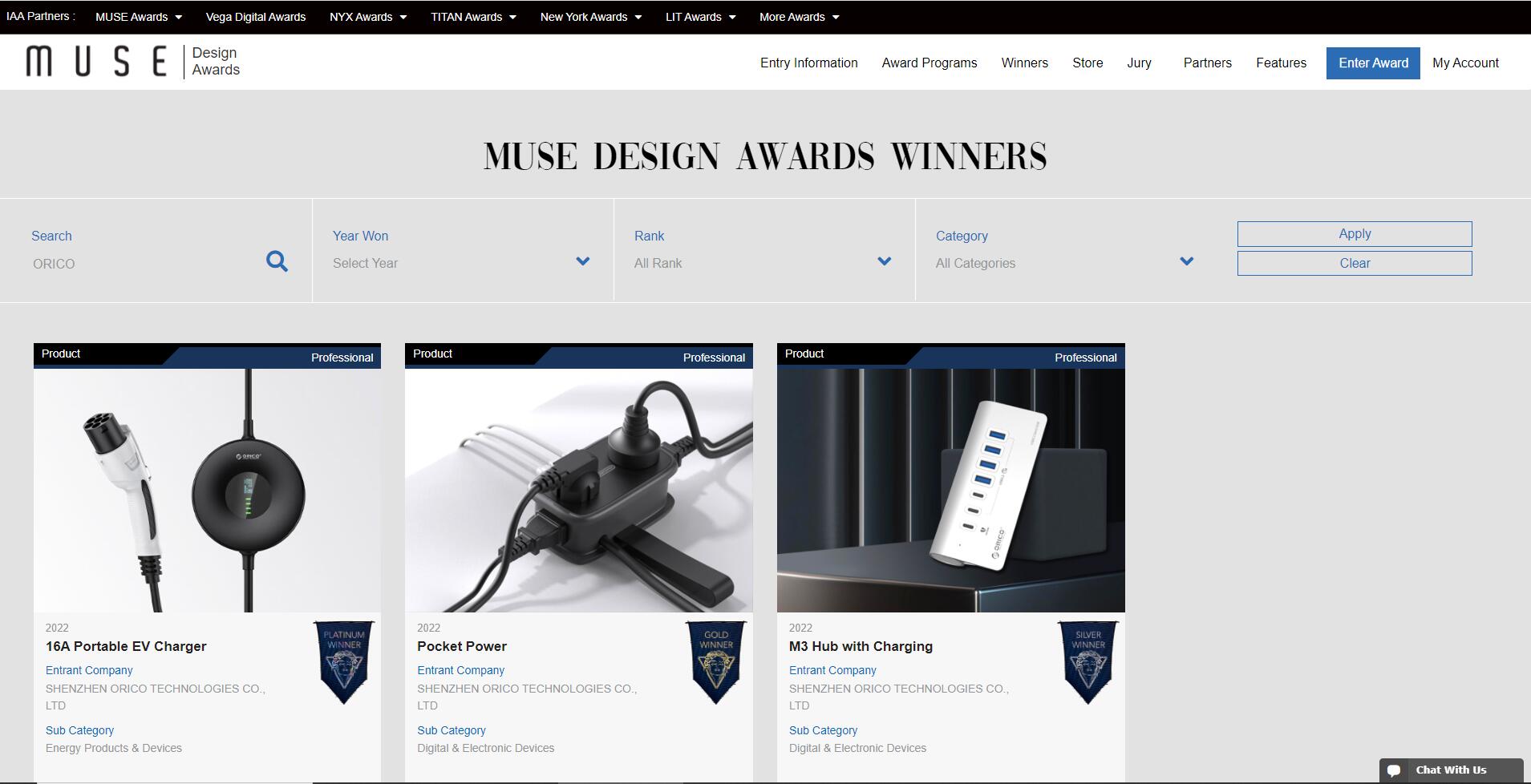 On September 06, 2022, Beijing time, the winners of the second quarter of the 2022 MUSE Design Awards were announced. Three products from two sub-brands of Shenzhen ORICO Technologies Co., LTD - ORICO and Ntonpower won this award. The ORICO M3 Docking Station and Ntonpower Pocket Socket stood out in the fierce competition and won the silver and gold awards of the 2022 American MUSE International Creative Awards respectively. Moreover, the ORICO Portable EV Charge Gun won the highest award - The Platinum Award, enriching the international award lists of the company.